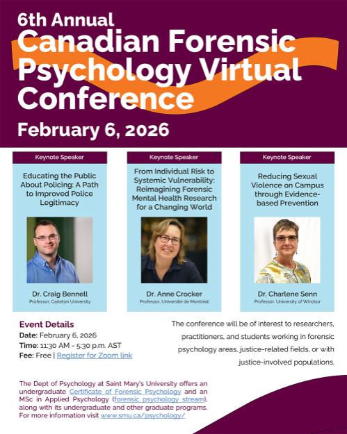 Saint Mary's University is proud to host the 6th Annual Canadian Forensic Psychology Virtual Conference by Zoom on Friday, February 6th, 2026, from 11:30 am to 5:30pm AST.